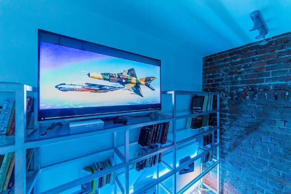 В зоне кухни на тросиках были подвешены линейные светодиодные светильники из алюминиевого профиля и светодиодной ленты RGB. Для подсветки других зон помещения, в частности пола спальной зоны, расположенной на втором уровне студии, была использована синяя светодиодная лента Arlight. Такая подсветка подчеркивает авиационную тематику интерьера, напоминая о голубом небе.